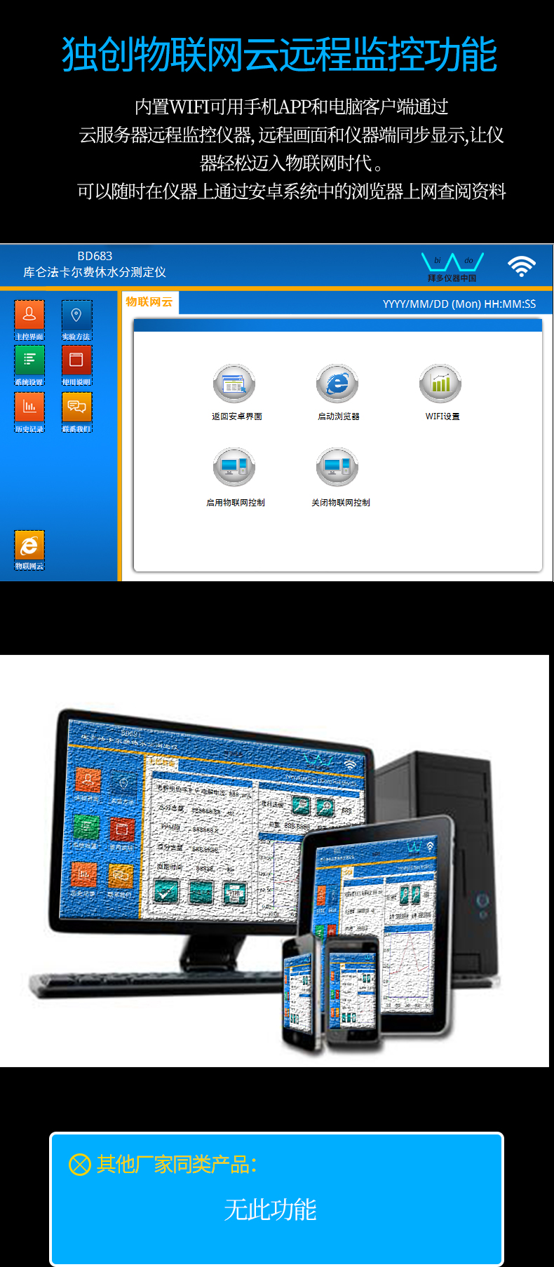 4.獨創(chuàng)物聯(lián)網(wǎng)遠程監(jiān)控模式,內置WIFI,可用手機或者電腦通過云服務器遠程監(jiān)控儀器,儀器端,電腦端,手機端畫面同步,讓儀器輕松邁入物聯(lián)網(wǎng)時代??梢噪S時在儀器上通過安卓系統(tǒng)的瀏覽器上網(wǎng)查閱資料。