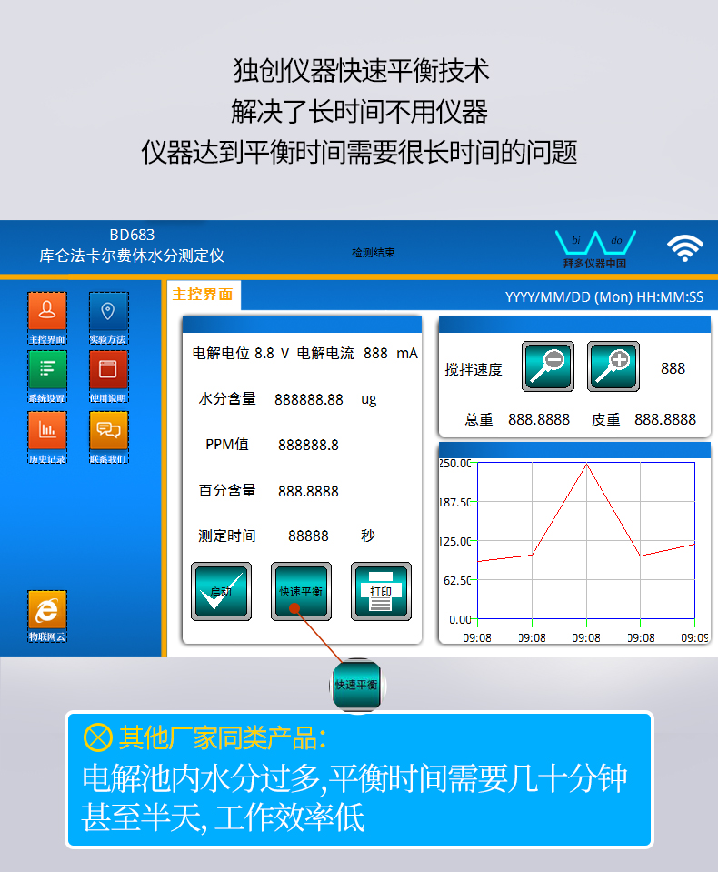 2.獨創(chuàng)儀器快速平衡技術,解決了長時間不用儀器,電解池內水分過多儀器達到平衡需要很長時間的問題,提高了工作效率。