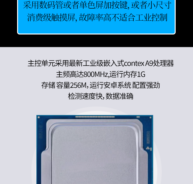 8.主控單元采用最新嵌入式contex-A9處理器,主頻高達800MHz,運行安卓系統(tǒng),配置強勁,檢測速度快,數(shù)據(jù)精度高。